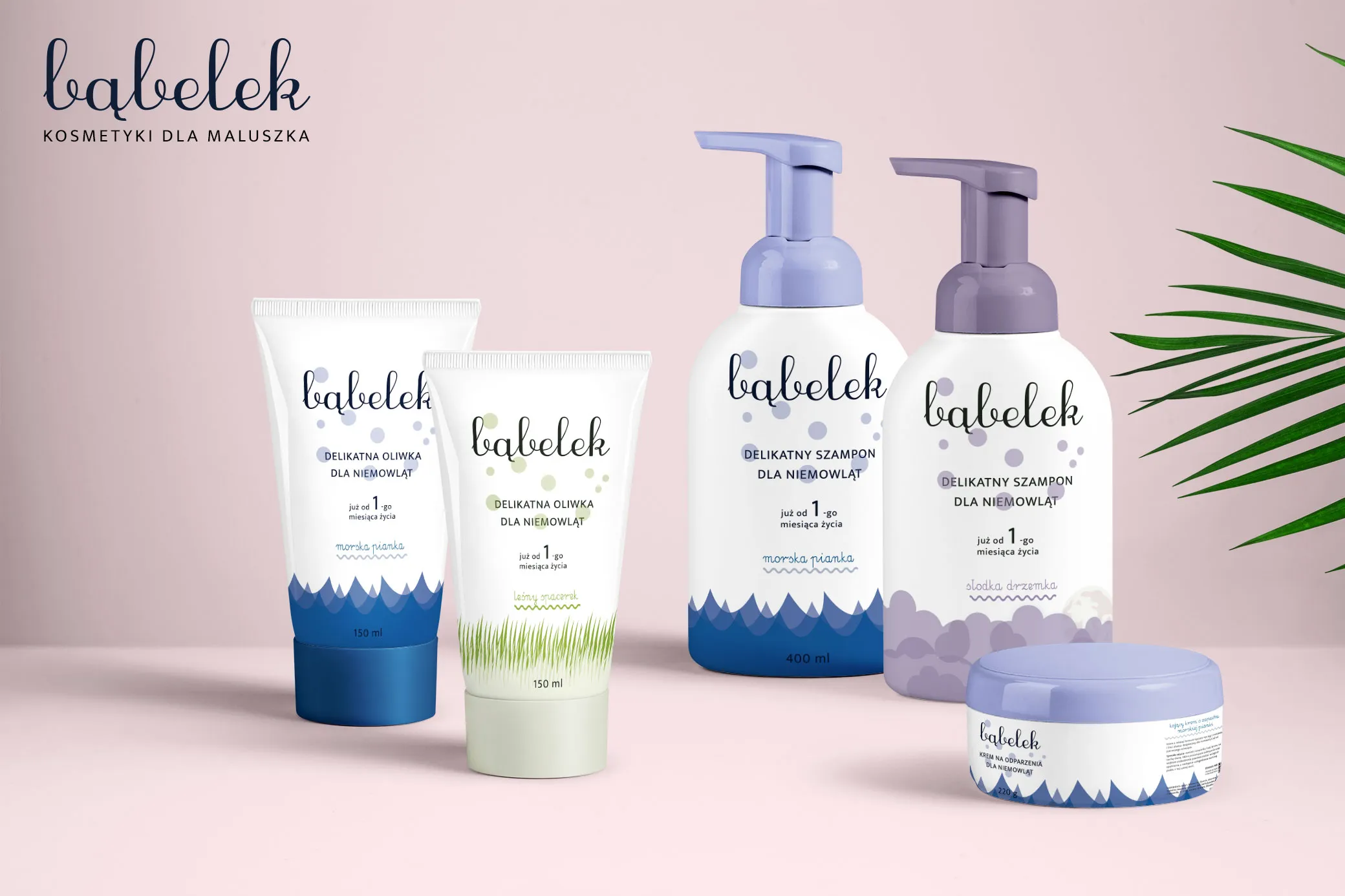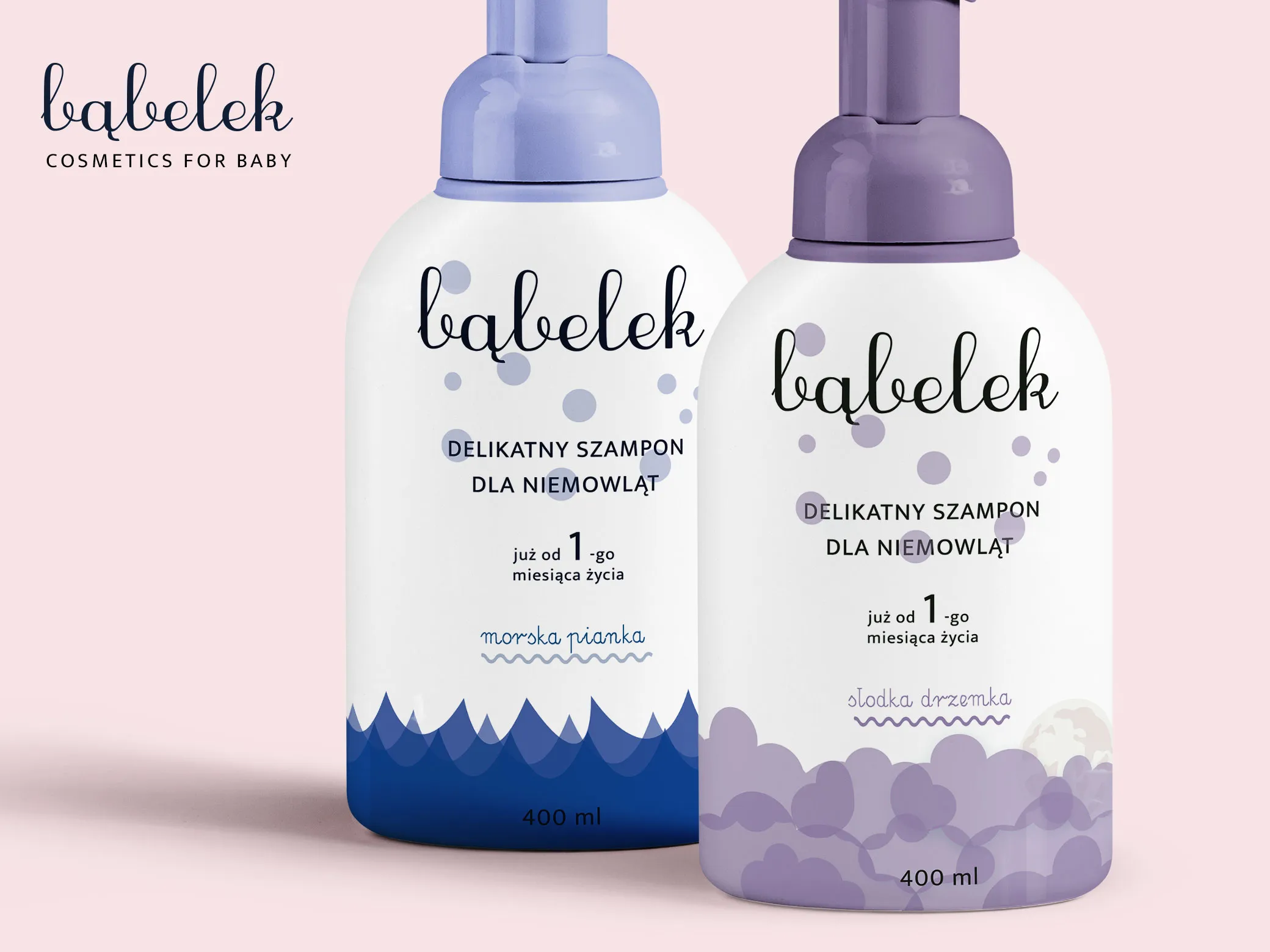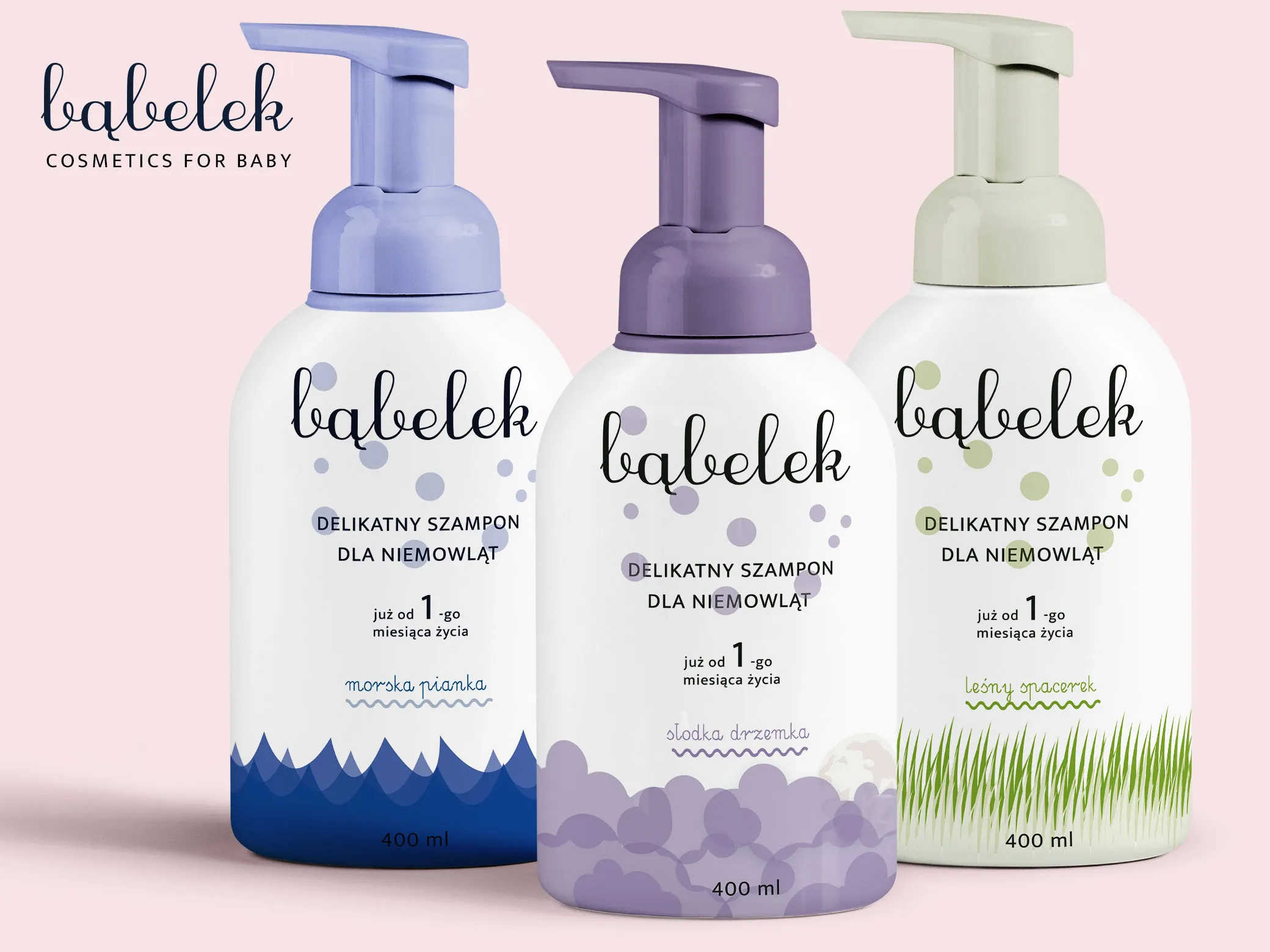 When this concept was created, awareness of the ingredients of cosmetics and their impact on the environment was just emerging. In hindsight, I think that the light tone suggesting safety for children's sensitive skin and the minimalist composition have stood the test of time, and I am doubly happy that the initial trend towards delicate natural cosmetics has not remained just a trend but an obvious concern for our health and the condition of the planet. The brand name "Bąbelek" in Polish is a term for a toddler and a bubble of bath foam, which creates a charming play on words and is memorable.